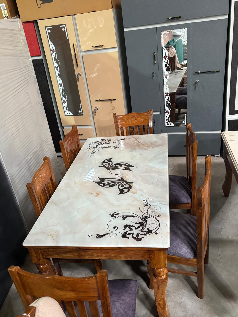 Stylish marble-top dining set with butterfly art design and premium wooden chairs.