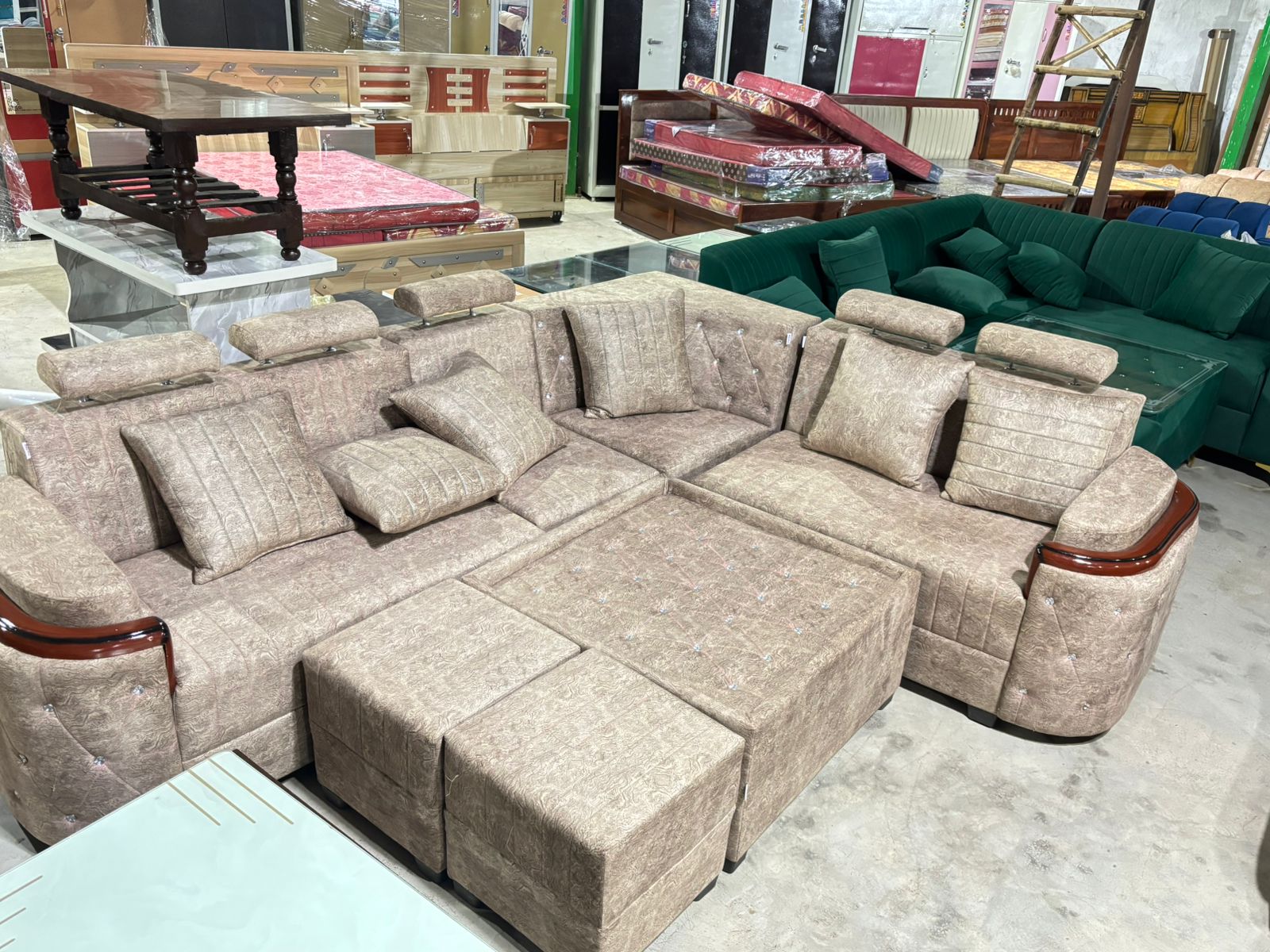 Dual grey cushions aur luxury fabric ke saath aata hai. Living room me classy aur comfortable seating provide karta hai. Modern interiors ke liye perfect pair.