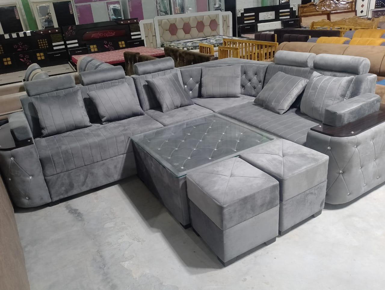Yeh corner sofa heavy-duty design aur luxury comfort ke sath aata hai. Padded backrest, head supports aur matching stools living room ki look ko royal banate hain. Large rooms ke liye perfect.