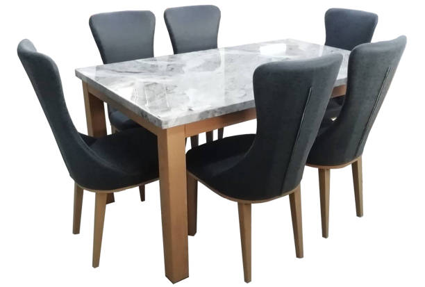 High-quality marble top dining set with gorgeous cushioned chairs.