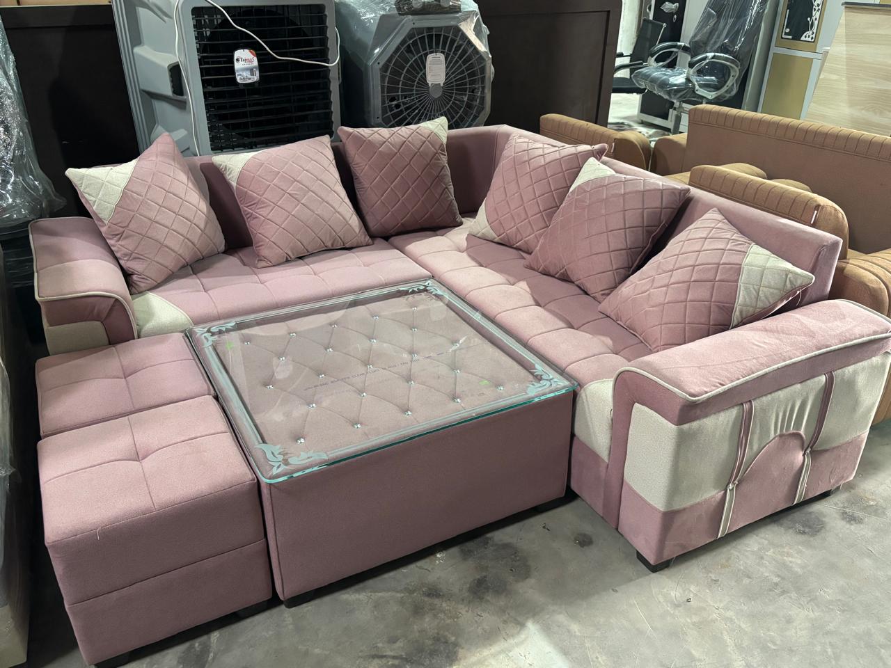 Royal Plush L-Shape Sofa aapke living room ko modern luxury look deta hai. Soft velvet feel, deep cushioned seating aur khubsurat designer pillows comfort ko next level tak le jaate hain. Center glass table aur ottomans is set ko aur premium banate hain — space aur comfort dono ka perfect combination!