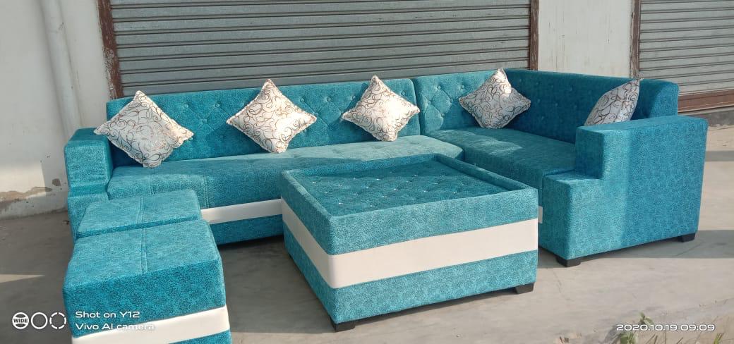 Beautiful sky blue color room ko fresh look deta hai. Soft cushion seating aur stylish center table ke sath aata hai. Family sitting, guest area aur modern interiors ke liye best pick!