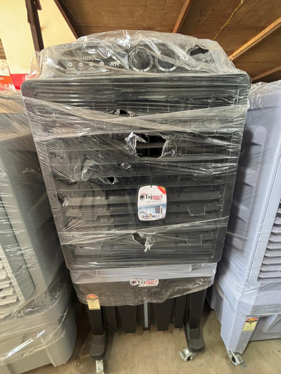 Tajmax Swing Air Cooler features an automatic swing air system that spreads cool air evenly across the room. It has a strong plastic body, powerful blower, and a large water tank for long-lasting cooling. Lightweight, easy to move, and energy-efficient—perfect for home, office, and shops.